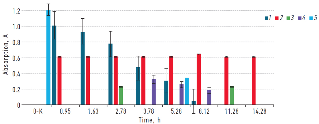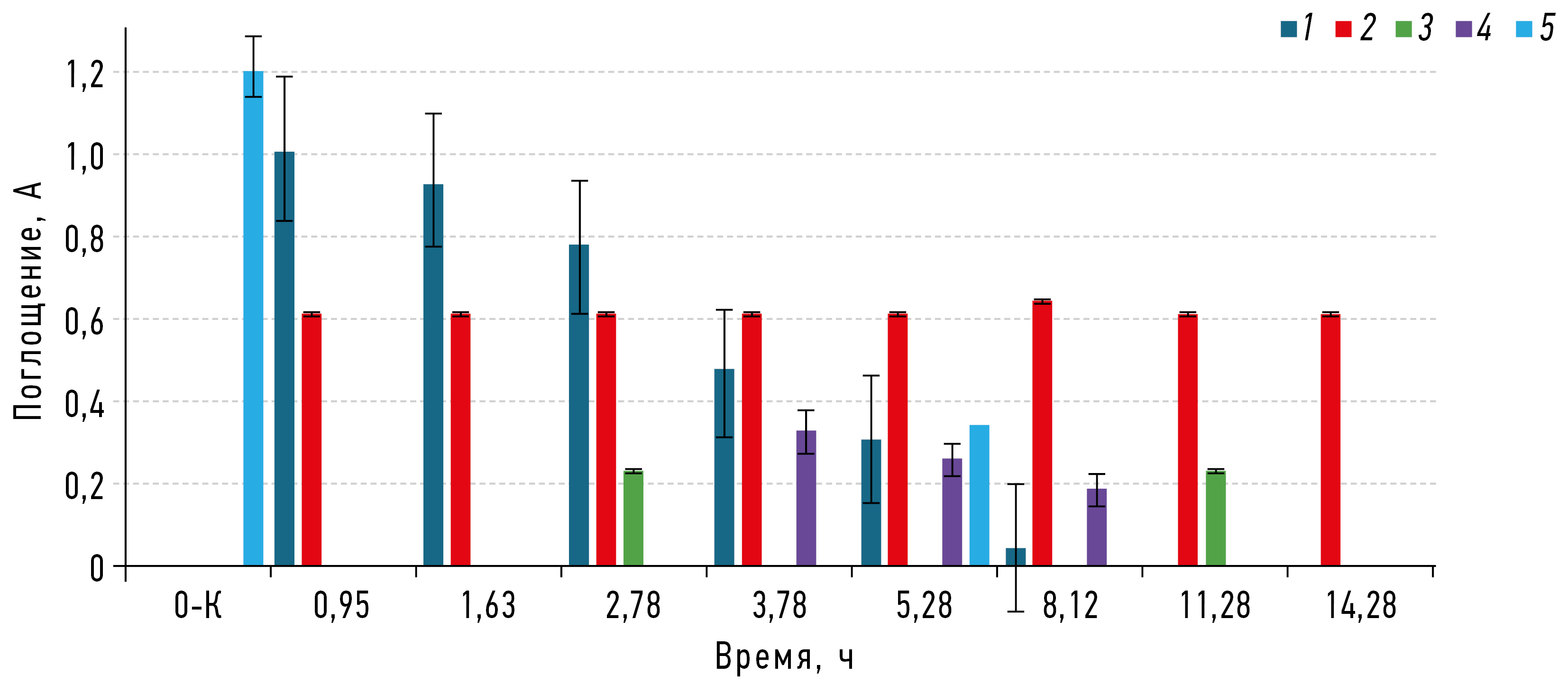 Fig. 2. Change in the absorption spectrum of the reaction mixture during the photochemical decomposition of an aqueous solution of N-phosphonomethylglycine under the combined influence of UV radiation and ozone over time: 1 — absorption intensity at λ = 212 nm; 2 — 195 nm; 3 — 286 nm; 4 — 258 nm; 5 — 238 nm. According to work [41]