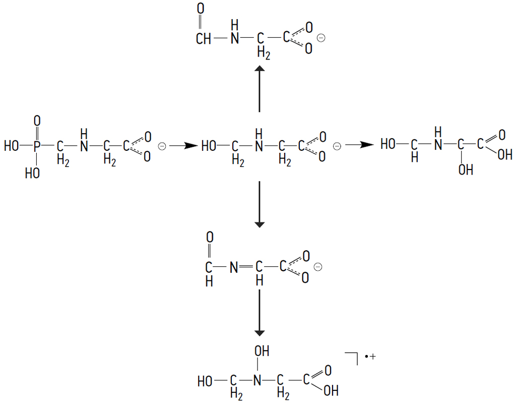 We can only hypothesize from which of the acid groups (carbonyl or phosphorus) the proton is abstracted, but the probability of both paths is obvious. Most likely, both particles are in a state of equilibrium. At the next, most probable stage, the phosphorus–carbon bond is quite easily hydrolyzed, while the phosphorus atom is oxidized under these environmental conditions from the formal valence (+4) (due to delocalization of electrons) to the most stable valence (+5) in N-PMG. As a result, phosphoric acid (H3PO4) is abstracted. The anions PO3– with m/z 78.95941 and H2PO4– with m/z 96.96990 were identified by MS.