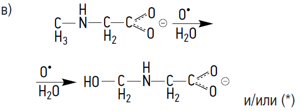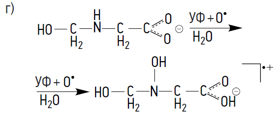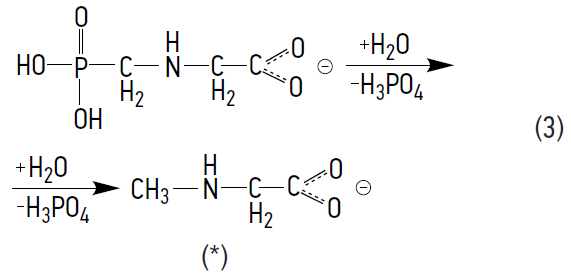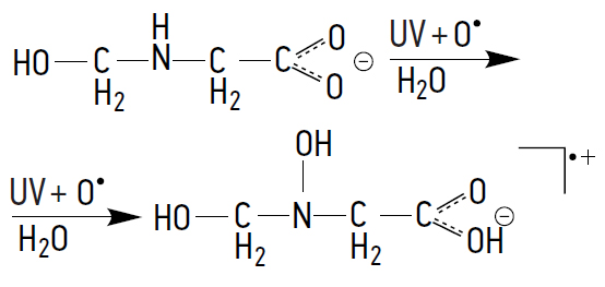 Table 1 presents the products of the photochemical decomposition of N-PMG. The following scheme for their formation can be proposed. Under the harsh oxidative conditions produced by N-PMG, namely an aqueous environment under the influence of UV and ozone (producing both O2– and O•), the entire N-PMG molecule becomes excited. Electrons move from the π-bonding to the π-antibonding levels of the molecule, which leads to its disintegration. In stage 1, a proton is lost to form a stable intermediate anion, which we can be detect using MS (m/z 168.0 [C3H7NO5P]–1) and UV spectroscopy (λ = 195 nm). Its stability can be explained by the delocalization of electrons throughout the molecule involving the conjugated double bonds C=O and P=O, as well as the lone electron pairs of nitrogen and oxygen atoms (2).
