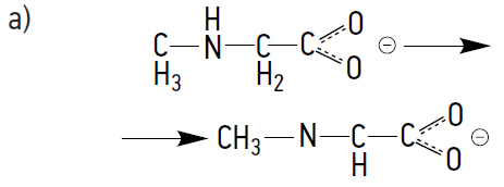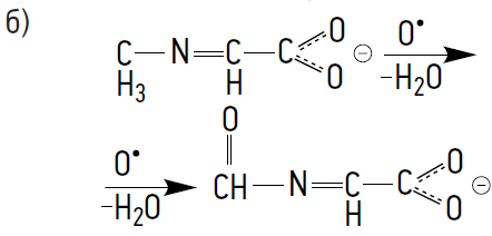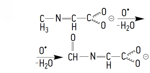 In the resulting intermediate, the anion (*) and the nitrogen (N) atom, with its lone electron pair, participate in conjugation with the carboxyl group (COOH). As a result, the cloud of π electrons is distributed throughout the molecule. This anion is sufficiently stabilized and from it, under such environmental conditions, subsequent reactions in several directions are possible, namely a) from the oxidative deprotonation of the N atom, compound No. 1 is formed, identified in MS with an m/z of 86.02510.
