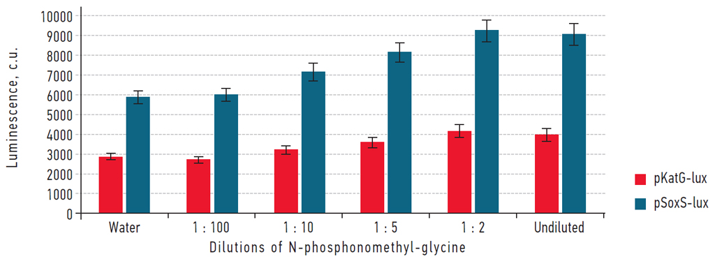 MATERIALS AND METHODS: The work used the active substance of the herbicide Roundup N-phosphonomethylglycine (N-PMG), biosensors E. coli (pSoxS-lux), E. coli (pKatG-lux). UV radiation, Mass spectrometry.