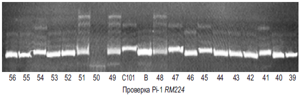 ПЦР-анализ образцов риса с использованием микросателлитного маркера RM224 к локусу Pi-1 показал, что он обеспечивает надежный хорошо воспроизводимый результат для идентификации этого гена. Результаты ДНК-маркирования гена Pi-1 в растениях F2, полученных при гибридизации C101-Lac × Боярин, показаны на рисунке 2.