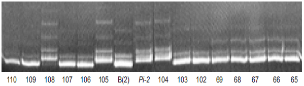 Наиболее информативными для анализа аллельных состояний локусов Pi-2 и Pi-33 являются SSR-маркеры RM527 и RM310 соответственно. Результаты электрофоретического разделения продуктов амплификации ДНК растений F2 с маркером RМ527, который сцеплен с геном Pi-2, показаны на рисунке 3. Доминантный аллель устойчивости Pi-2 донорной родительской линии C101-A-51 был обнаружен в гомозиготном состоянии у генотипов 108, 105, 104. У других растений выявлен только рецессивный аллель от сорта Боярин, и они были выбракованы в ходе селекции.