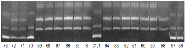 Рис. 4. Результаты разделения методом электрофореза продуктов амплификации ДНК-растений F2 (C101-Lac × Боярин) с маркером RM310 к гену устойчивости риса к пирикуляриозу Pi-33. Примечание: 73–56 — анализируемые растения; B — сорт-реципиент Боярин; линия C101-Lac — донор гена Pi-33. При наличии доминантного аллеля Pi-33 амплифицируется фрагмент размером 85 п. н.