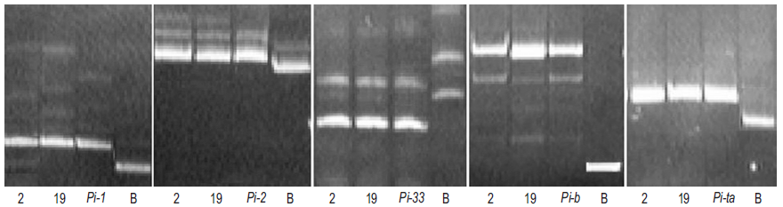 Для идентификации генов применяли микросателлитные SSR-маркеры. Нуклеотидные последовательности праймеров представлены на сайте www.gramene.org. В течение всех циклов возвратных скрещиваний перенос доминантных аллелей каждого такого гена в потомстве контролировался тесно сцепленными или внутригенными молекулярными маркерами. Для определения гена Pi-1 использовали маркеры RM224, гена Pi-2 — RM527, гена Pi-33 — RM310, Pi-40 — RM527. Они локализованы в хромосомах: 11, 6, 8, 6 соответственно. Внутригенные маркеры, созданные в лаборатории биотехнологии Всероссийского НИИ риса, применялись для идентификации генов Pi-b (IGM Pi-b, хромосома 2) и Pi-ta (IGM Pi-ta, хромосома 12) [28, 29].