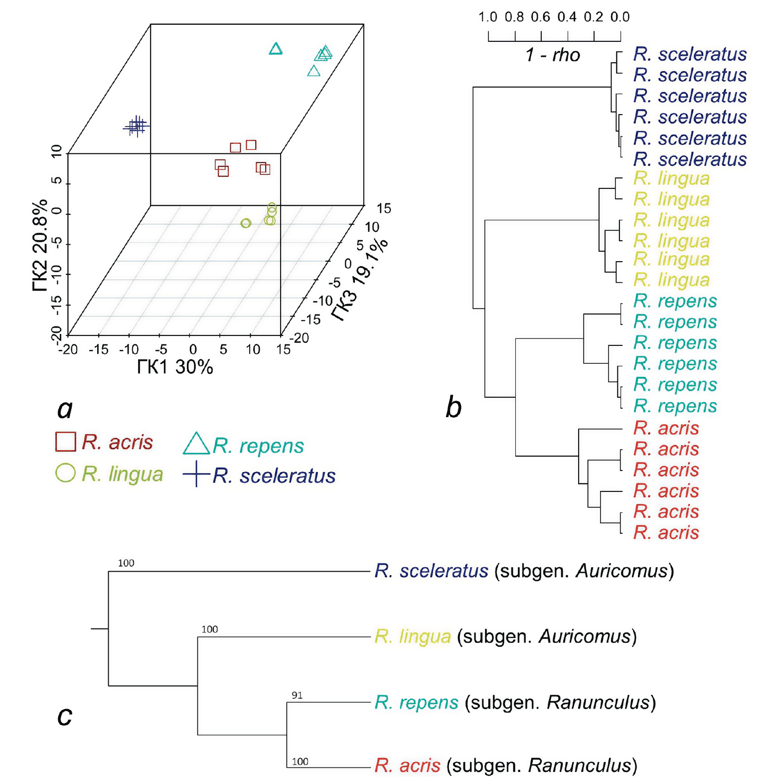 Рис. 2. Анализ без обучения профилей метаболитов четырех видов Ranunculus: a — графики счетов методом главных компонент (ГК); b — дендрограмма иерархической кластеризации метаболических профилей, с расстоянием Пирсона (1 – rho), агломерация методом Уорда; c — диаграмма филогенетических взаимоотношений четырех исследованных видов рода Ranunculus (по: [27], с изменениями). Построена на основе анализа методом максимальной парсимонии с использованием ядерного (ITS-область ядерной рибосомной ДНК) и двух хлоропластных маркеров (matK/trnK)