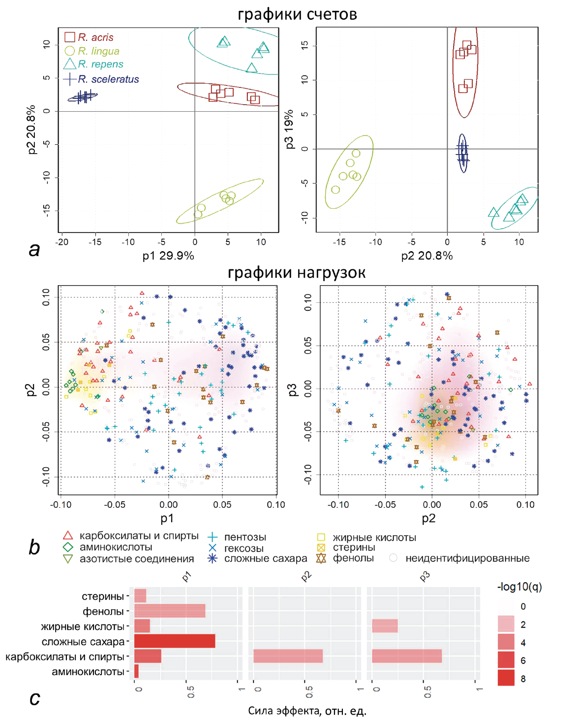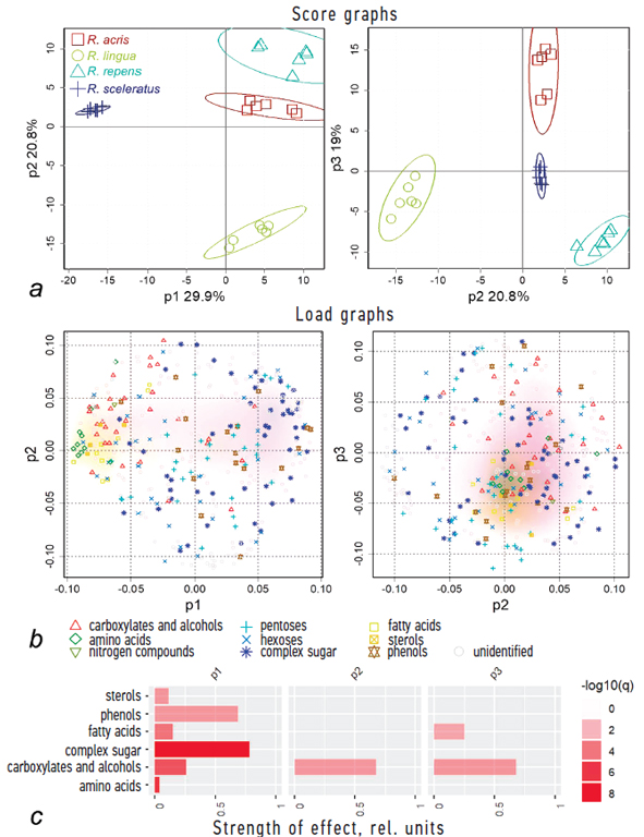Рис. 3. Классификация четырех видов Ranunculus по результатам анализа PLS-DA: a — график счетов PLS-DA моделей; b — график нагрузок PLS-DA моделей, символы и цвета соответствуют классам веществ; c — анализ обогащения набора метаболитов (U-тест) по нагрузкам первых трех компонентов PLS-DA моделей и наборов метаболитов, представляющих химические группы. q — Уровень ложноположительных результатов