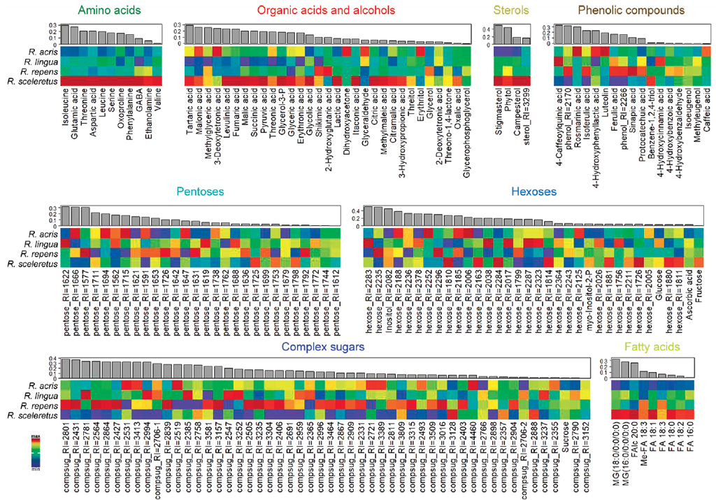 RESULTS: The resulting profile included 360 compounds. 74 of these were identified and 114 compounds were determined to a class. Sugars (114) were the most widely represented in the obtained profiles. 10 amino and 23 carboxylic acids, lipids and phenolic compounds have been identified. Significant differences were revealed between the profiles of leaf metabolomes of all tested species, which were clustered according to phylogenetic relation. The hydrophytic R. sceleratus, growing under submergence, showed the most unique metabolome, in which the level of sugars was reduced and intermediates of anaerobic metabolism, nitrogen metabolism, and alternative pathways of NAD(P)H reoxidation were accumulated. The profile of mesophytic R. acris was markedly different by decreased levels of amino acids, fatty acids and sterols. The metabolite profiles of waterlogged hydrophytes R. lingua and R. repens occupied an intermediate position.