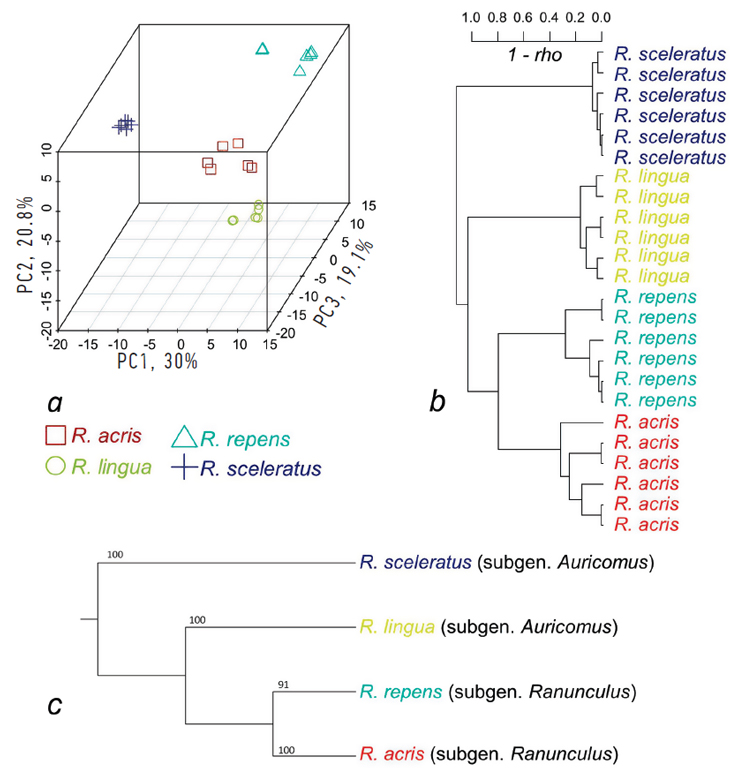 Fig. 2. Unsupervised analysis of metabolite profiles from four Ranunculus species: a — PCA score plots; b — dendrogram of hierarchical clustering of metabolic profiles, with Pearson distance (1 – rho), Ward method; c — dendrogram of the phylogenetic relationships of studied Ranunculus species of the combined plastid and ITS dataset based on Maximum Parsimony analyses (after: [27], with modifications)
