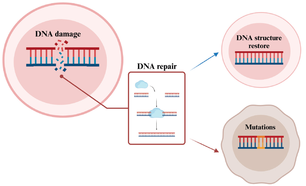 Thus, the physiological hypothesis of the mutation process connected the concepts of mutation and repair for the first time, leading to the development of new ideas about the mechanism of mutation generation as a process, revealing that lesions in genetic material caused by mutagens do not necessarily result in a mutation. In the 1940s, when M.E. Lobachev formulated his theory, the role of DNA as a carrier of genetic information has not yet been established. Despite being based on the idea of the protein nature of genetic material, the physiological hypothesis revealed that the general principle of denaturation-repair of macromolecules also applies to DNA. The formation of a mutation is a complex physiological process that occurs during the repair of damaged DNA through non-identical repair. DNA repair can be inaccurate, leading to a mutational change or accurate, resulting in the restoration of the original genetic material structure (Fig. 1). The global scientific community only came to understand the connection between mutations and repair in the 1960s [27].