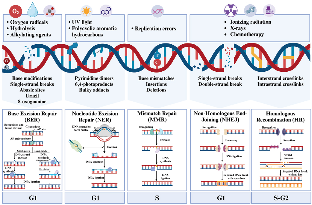 Fig. 2. Primary DNA lesions, repair mechanisms, and the cell cycle stages during which the corresponding repair systems are active [39]