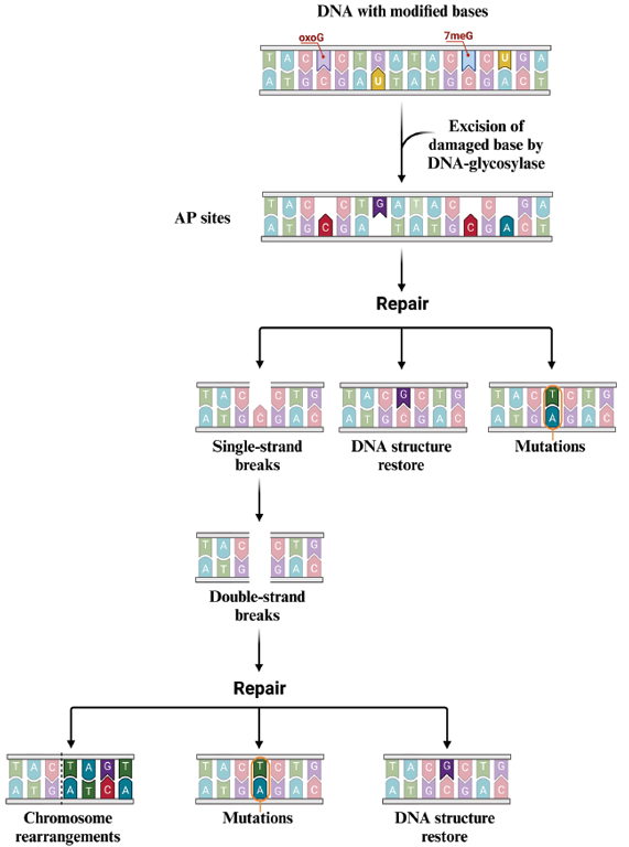 Primary DNA lesions are able to interrupt the replication of genetic material and the expression of genetic information. They can reduce the accuracy of replication, serve as signals to trigger repair systems, an essential step of which is homologous and non-homologous recombination, and can lead to the arrest of cell divisions [30, 31]. Primary DNA lesions contribute to the aging and the development of many diseases, such as cancer, neurodegenerative diseases, and fetal intrauterine defects [32, 34, 40–42]. Therefore, pro- and eukaryotic organisms have various repair systems and mechanisms of temporary DNA damage tolerance (Fig. 2). DNA repair may take a relatively long time and occurs in several stages. Different repair systems are responsible for repairing lesions of varying chemical structures. Generally, the initial stage of repair includes the excision of the damaged DNA site and the subsequent feeling of the resulting gap by a DNA polymerase. If double strand brakes, the most severe DNA lesions, occur, then homologous recombination and non-homologous end joining of two DNA molecules are also potential ways of repair. Often, intermediate products of incomplete repair serve as a substrate for subsequent repair steps. Thus, during the repair of lesions, interconversion may happen, which can impact the expression of damaged genes to different extents. For example, when modified bases are eliminated during base excision repair (BER), DNA glycosylase excises the damaged bases to form AP sites, which have been observed to have a lifespan of up to 190 hours at physiological temperature and pH, as demonstrated in vitro using bacterial phage PM2 [43]. The formation of AP sites can result in replication fork arrest and must be eliminated before replication to prevent cell death. Eliminating AP sites can cause single-strand breaks, which in turn trigger the formation of double-strand breaks and recombination (Fig. 3) [44, 45]. Double-strand breaks can lead to the loss of chromosomes or parts of chromosomes and, if inaccurately repaired through recombination repair or direct end joining, can result in gene mutations and chromosome rearrangement (Fig. 3) [30, 46, 47].