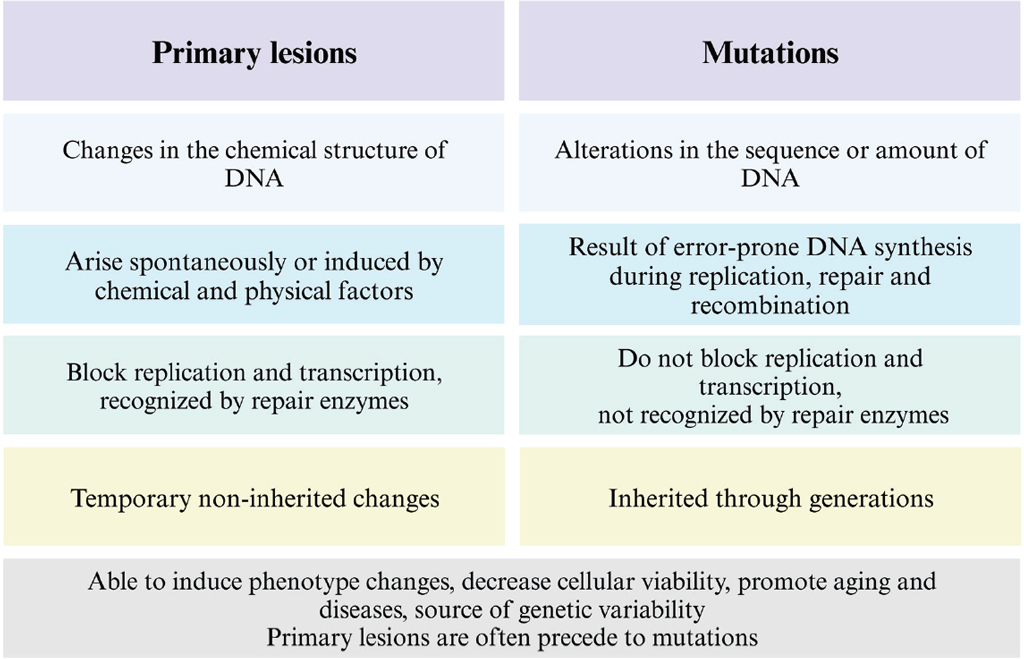 Fig. 4. Main similarities and differences between genetic material alterations of two types — primary lesions and mutations
