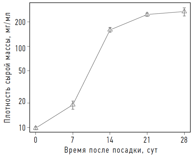 На 7-е сутки культуры характеризовались интенсивным ростом плотности биомассы. На 28-е сутки плотность сырой массы не изменялась более 7 дней, что свидетельствует о полном исчерпании ресурсов и завершении развития культуры (рис. 1).