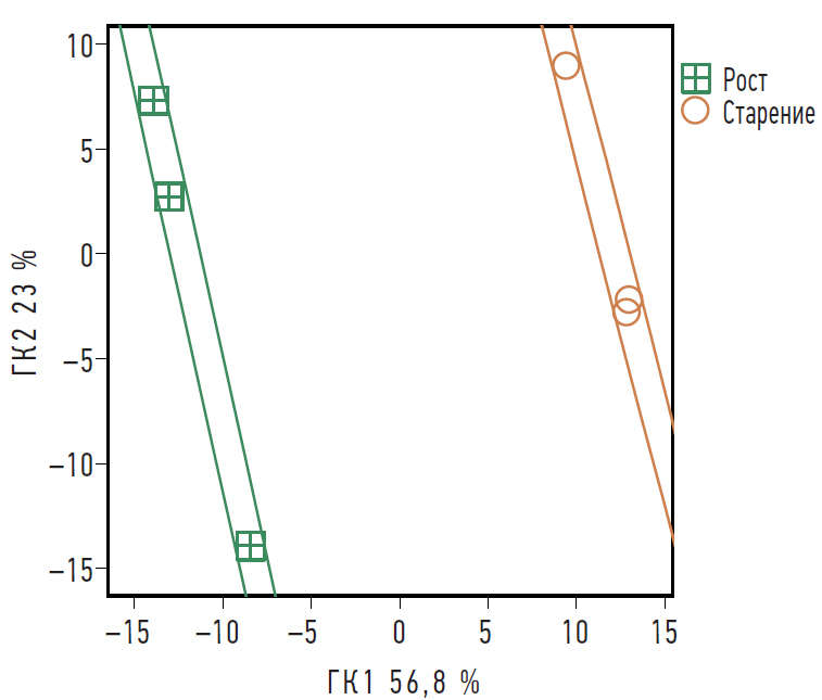 Для определения сходства профилей культур в фазе роста и старения был проведен PCA. На рис. 2 профили метаболитов рассеяны в пространстве счетов первых двух главных компонент (ГК). Можно видеть, что наблюдения четко разделены в соответствии с возрастом вдоль ГК1, объясняющей 56,8 % дисперсии. Индивидуальные различия культур одного возраста связаны с ГК2, объясняющей 23 %.