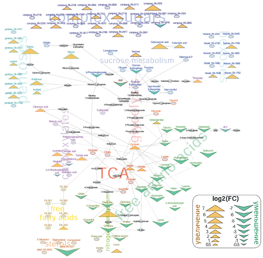 В результате анализа ГХ-МС были получены профили метаболитов, которые включали около 300 соединений, 84 из них были определены по совпадению масс-спектров и индексов удерживания с библиотечными, а еще для 44 был аннотирован химический класс. Остальные спектры не были идентифицированы, но были использованы в анализе. Наиболее многочисленными в полученных профилях метаболитов были сахара и их производные (в сумме около 60), сахароспирты, сахарокислоты, фосфосахара, пентозы (включая рибозу), гексозы (в том числе глюкоза и фруктоза), олигосахариды, например сахароза. Было аннотировано большое число сложных молекул, содержащих остатки сахаров, объединяющих, по-видимому, многочисленные ди- и трисахариды, а также вторичные соединения, такие как гликозиды. Профили также включали 24 аминокислоты, из них 17 стандартных, около 20 карбоновых кислот, среди которых присутствовали интермедиаты энергетического обмена. В небольшом количестве обнаружены свободные жирные кислоты и стерины.
