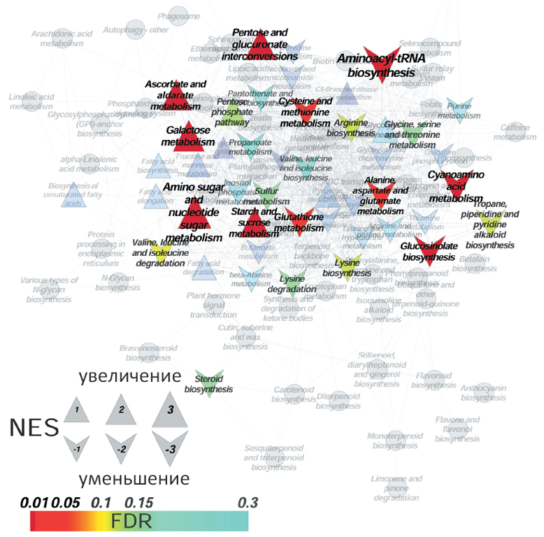 Рис. 4. Анализ обогащения, полученный на основе нагрузок предиктивной компоненты ОПЛС-ДА. Сеть метаболических путей, реализуемых в клетках N. tabacum. Узлы — метаболические пути из базы данных KEGG. Если они имеют общие метаболиты в профиле, то они соединены ребрами, которые их стягивают. Размер — NES, нормализованная оценка обогащения (normalized enrichment score), цвет — FDR, уровень ложноположительных результатов (false discovery rate). Треугольники с вершиной, направленной вверх соответствуют более высокому накоплению интермедиатов пути при старении
