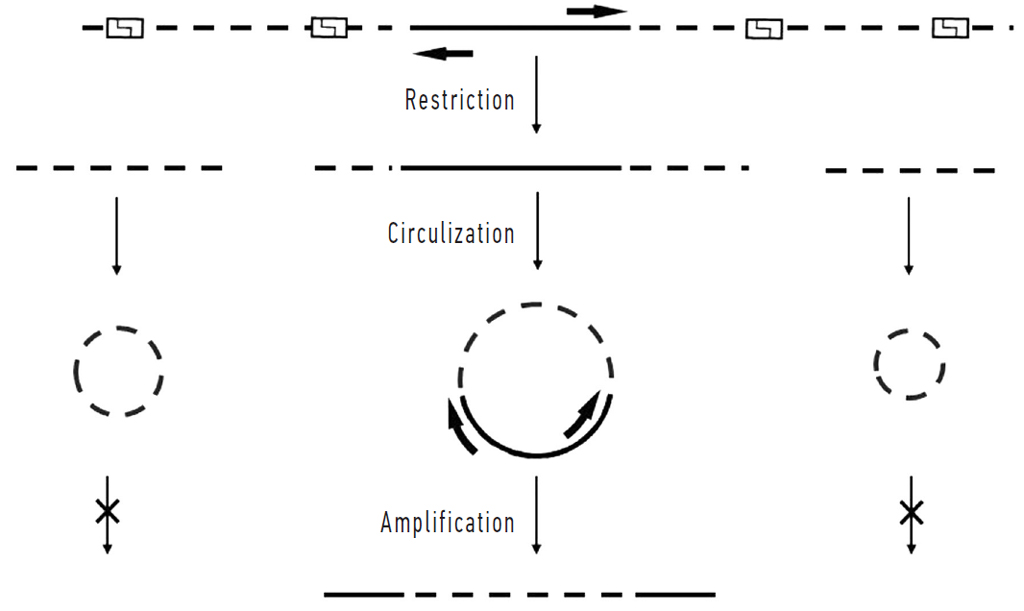 The first chain forms a loop by in-chain annealing between the complementary annealing site of primer #2 and its copy at the other end of the sequence. Next comes the elongation of this chain after the loop along itself, producing a product containing known sequences at the edges and an unknown region in the center.