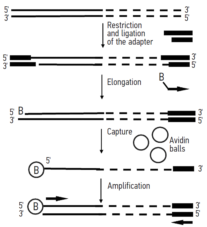 Fig. 5. Schematic representation of the Capture PCR (CPCR)(based on M. Lagerstrom et al. [10]). Solid line, genomic DNA; black rectangles, adapters; arrow, primer binding site; B, biotin. The first strand is synthesized using a single gene-specific biotinylated primer, enabling the fixation of this fragment on a streptavidin-coated substrate. Unlabeled DNA is removed during washing. The target fragment is then amplified with a primer to the adapter and a second specific primer