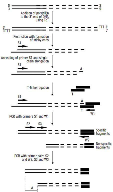 T-linker-specific ligation PCR (T-linker PCR; 2003) involves PCR with T-linker ligation to walk chromosomes or genes. In the first step, poly(dT)n is added to the 3'-ends of genomic DNA molecules using terminal deoxynucleotidyl transferase (TdT). This addition is necessary to prevent nonspecific binding to adapters later on. DNA with poly(dT)n-sequenced DNA is cleaved with restriction enzymes to form 3'-protruding ends without A. The second step involves chain elongation of the target molecule using specific primer S1 and formation of a “tail” with A at the 3'-end using TaqDNA polymerase. Using T4 DNA ligase, a T-linker is ligated at the 3'-end of the target molecule. This is followed by two rounds of nested PCR to amplify the target molecule; the first round uses the external primer pair S1 and W1, while the second round uses primer pairs S2-W2 and S3-W2. Specifically amplified molecules are identified based on the length differences (Δ S2-S3) between the S2-W2 and S3-W2 primer products (Figure 6) [15].