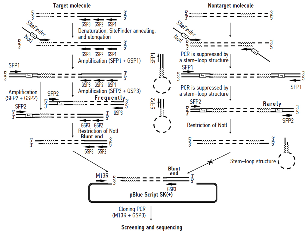 First, the SiteFinding reaction is performed with low-temperature annealing to form the restriction site Notl. In a desired embodiment, this reaction produces a fragment comprising the boundary of known and unknown DNA with NotI restriction sites and the primer landing sites SFP1 and GSP1. Second, nested PCR follows: the target DNA is exponentially amplified using nested PCR with GSP and primers SFP1 and SFP2. As the primer planting process is random, it is possible to form untargeted double-stranded products containing SFP planting sites at both ends. Further amplification is suppressed due to the formation of stem–loop structures due to the presence of inverted end repeats (this sequence does not further participate in the reaction). Third, the SFP-GSP amplification product undergoes NotI cleavage and is purified by electrophoretic separation on an agarose gel. This results in target molecules with one sticky (in the restriction site) and one blunt end, facilitating the ligation of such fragments into the linearized pBluescript SK(+) vector. Restriction products with two sticky ends or in a stem-loop structure cannot be introduced into the vector.
