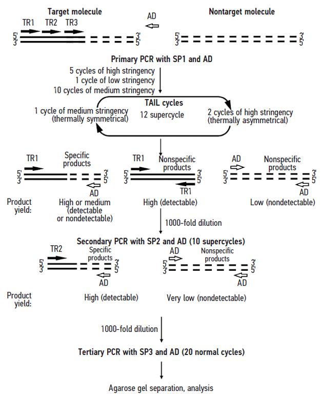 This approach uses three types of primers: “target” primers, which hybridize with a specific known target sequence; “internal” ³²P-labeled detection primers, which are located a short distance inward relative to the “target” PCR primers; and “walking” primers, for hybridization with unknown sequences.