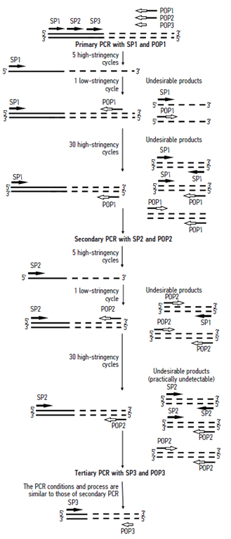 The group of PCR techniques that use random primers involves the use of sets of nonspecific primers that can randomly sit on a DNA molecule during PCR. This category does not require complex DNA manipulation before or after PCR. Typically, these methods involve alternating cycles of high and low annealing temperatures. Primary PCR uses a cycle with mild conditions to increase the likelihood of planting “walking” primers on an unknown DNA sequence. This is followed by 2–3 rounds of nested PCR under stringent conditions for efficient annealing of site-specific primers. These cycles are performed to exponentially amplify the target fragments and eliminate false results (Figure 7). The differences in the methods of this group lie in the structure of the “walking” primers and in the number and manner of alternating cycles under different annealing conditions.