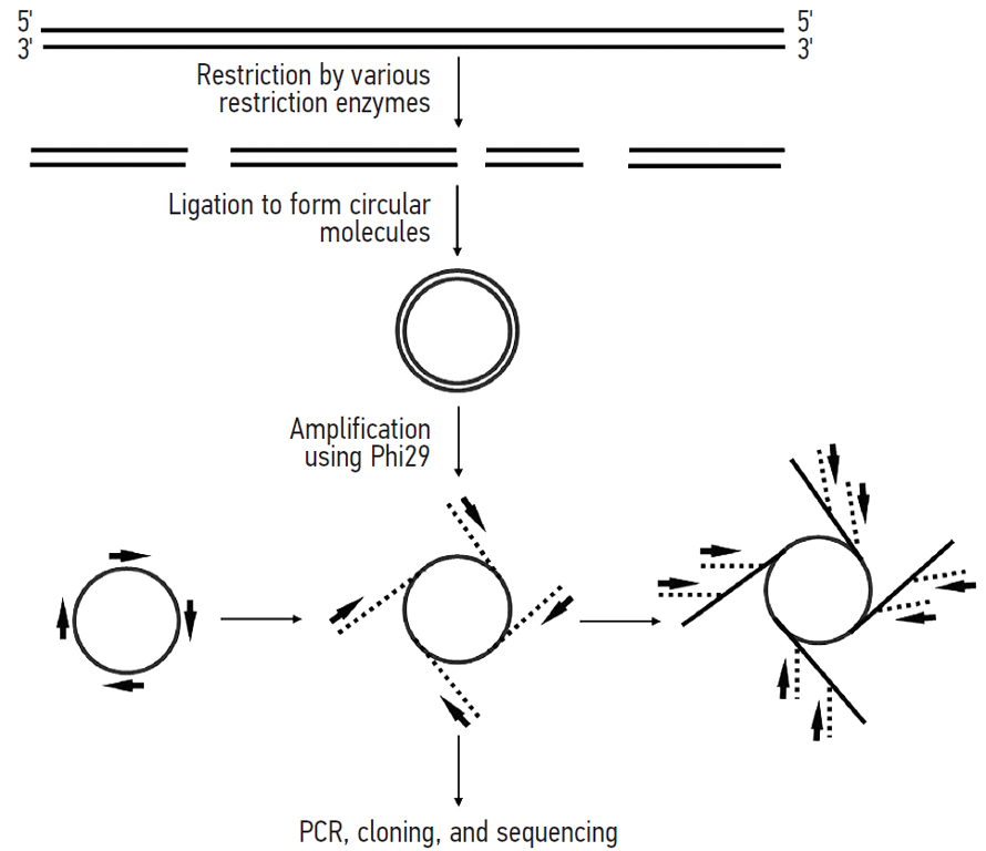 Denaturation and intrachain annealing are performed to form a circular structure with a long end. An unknown sequence appears in the structure of the circle. A fragment containing an unknown site is amplified using two pairs of nested primers [13].