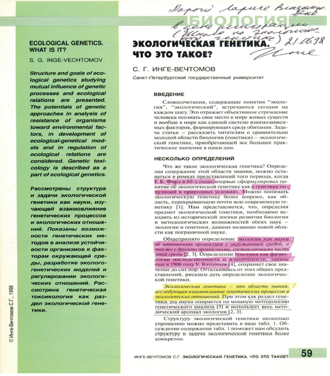The journal Ecological Genetics is celebrating anniversary this year. Its creation was determined by several factors, with the most significant being the urgent need, at that time, to document the content of the actively developing field of ecological genetics and to coordinate scientific research in the field. In 1989, we proposed a solution to this challenging problem in the Soros journal with the article “Ecological genetics. What is it?” (S.G. Inge-Vechtomov) (Fig. 1). The article mainly focused on the scientific research conducted at the Department of Genetics and Selection (Department of Genetics and Biotechnology since 2012) of St. Petersburg State University in recent years, and the formation of educational programs within a unified plan for training geneticists.