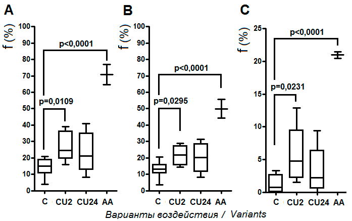 Рис. 1. Общая частота поврежденных ядер с содержанием ДНК в хвосте кометы > 5 % (а), частоты слабо- (b) и сильноповрежденных (c) ядер клеток костного мозга с содержанием ДНК в хвосте комет 5–20 % и >20 % соответственно у самцов мышей линии СВА после воздействия мочой котов. Варианты воздействия: C — контроль; CU2 и CU24 — 2- и 24-часовое воздействие мочой котов соответственно; АА — инъекция акриламида. Приведены значения медиан, границ первого и третьего квартилей, минимальное и максимальное значения, скобками сверху указаны достоверно отличающиеся варианты (критерий Манна — Уитни)