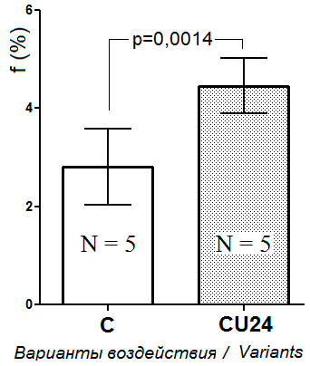 Рис. 2. Общая частота хромосомных аберраций (Mean ± ± 95 % SD) в делящихся клетках костного мозга самцов мышей линии СВА после 24-часового воздействия летучими хемосигналами мочи котов. C — контроль (вода); CU 24 — 24-часовое воздействие мочой котов; для выявления различий использовался t-критерий; N — число животных в группе