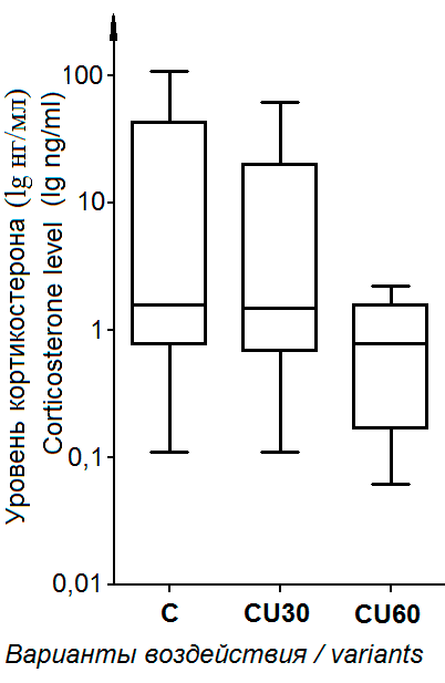 Рис. 3. Уровень кортикостерона в плазме крови самцов мышей линии СВА после воздействия хемосигналами мочи котов. C — контроль; CU30 и CU60 — 30 и 60-минутное воздействие хемосигналами мочи котов, соответственно. Для каждого варианта отмечены медианы, границы первого и третьего квартилей, минимальное и максимальное значения (критерий Манна – Уитни, p > 0,1)
