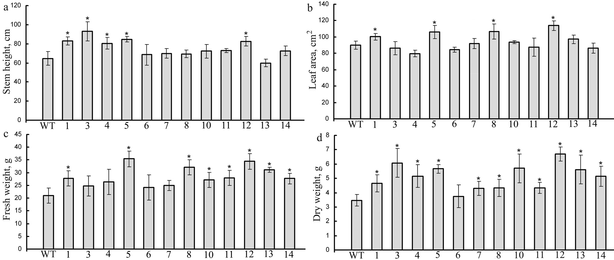 Рис. 1. Морфометрические параметры трансгенных растений табака, сверхэкспрессирующих ген BnGSH при нормальных условиях произрастания: a — высота стебля; b — площадь листьев; c — сырая масса надземной части; d — сухая масса надземной части. ДТ — дикий тип, 1–14 — линии трансгенных растений. n = 5. * p < 0,01