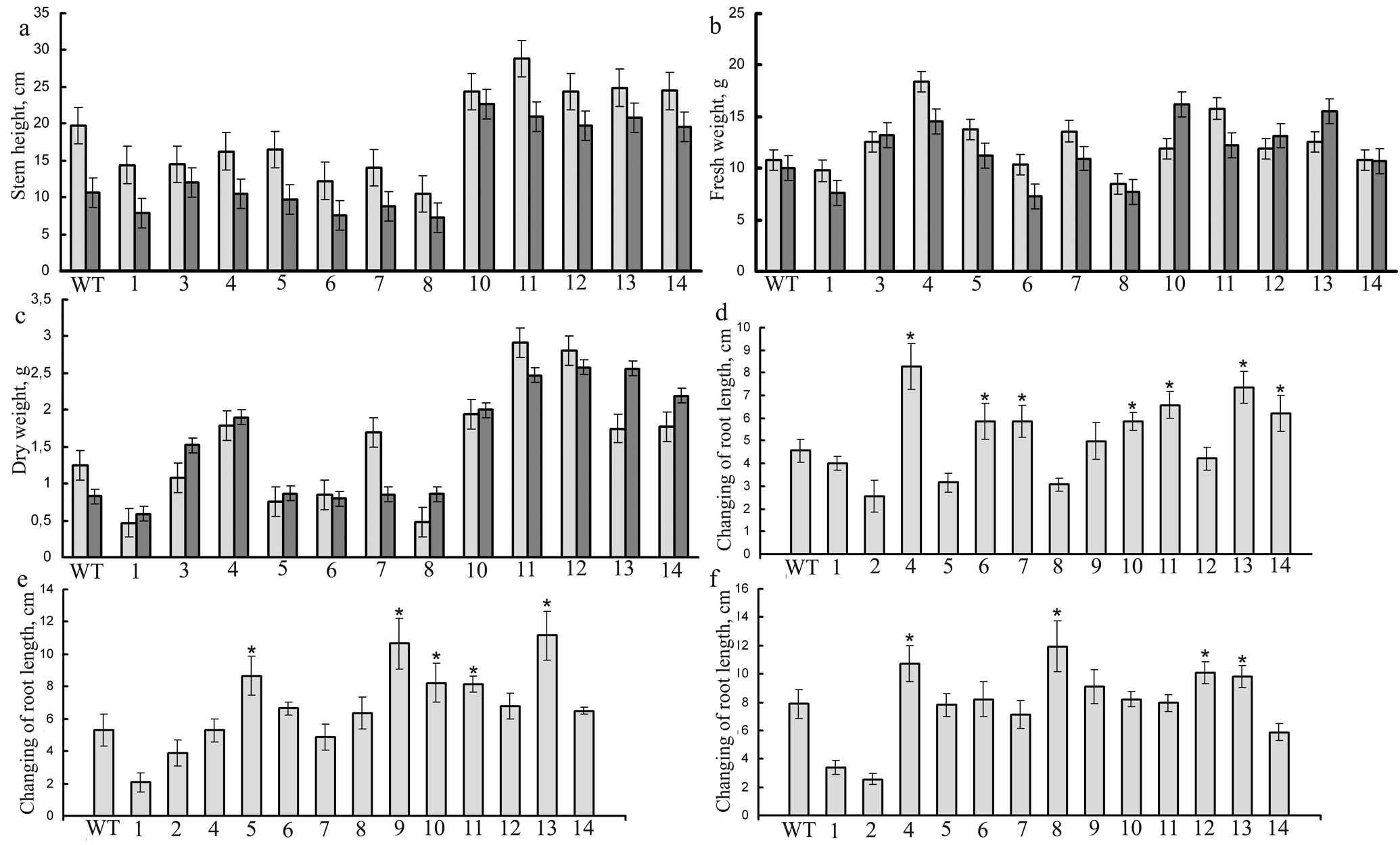 Длина корней при выращивании на вертикально ориентированных чашках Петри была проанализирована у 13 линий трансгенных растений табака. При нормальных условиях достоверное увеличение длины корней по сравнению с диким типом было выявлено у линий 4, 6, 7, 10, 11, 13 и 14 (рис. 2, d). При выращивании на среде с 50 мМ NaCl улучшенные по сравнению с диким типом ростовые параметры были обнаружены у линий 5, 9, 10, 11 и 13 (рис. 2, e). При действии 100 мМ NaCl более быстрыми темпами роста корней характеризовались линии 4, 8, 12 и 13 (рис. 2, f).