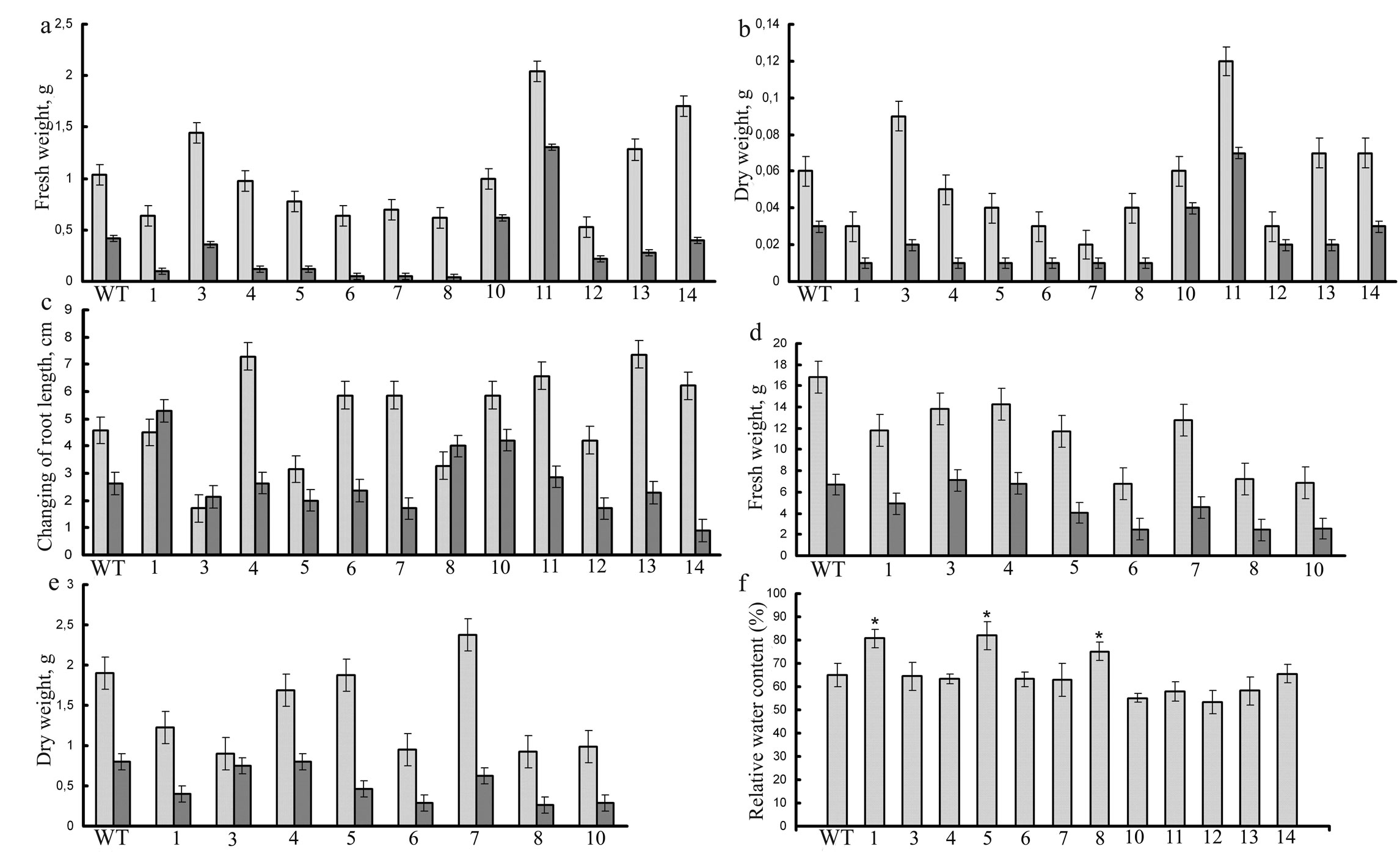Способность трансгенных растений расти в условиях засухи часто связана с более эффективным сохранением воды в тканях и органах [16]. Исходя из этого нами было оценено относительное содержание воды (RWC) в анализируемых растениях. Достоверное увеличение этого показателя по сравнению с растениями дикого типа было зафиксировано у линий 1, 5 и 8 (рис. 3, f). Однако данные по RWC не коррелировали с результатами морфометрии при засухе.