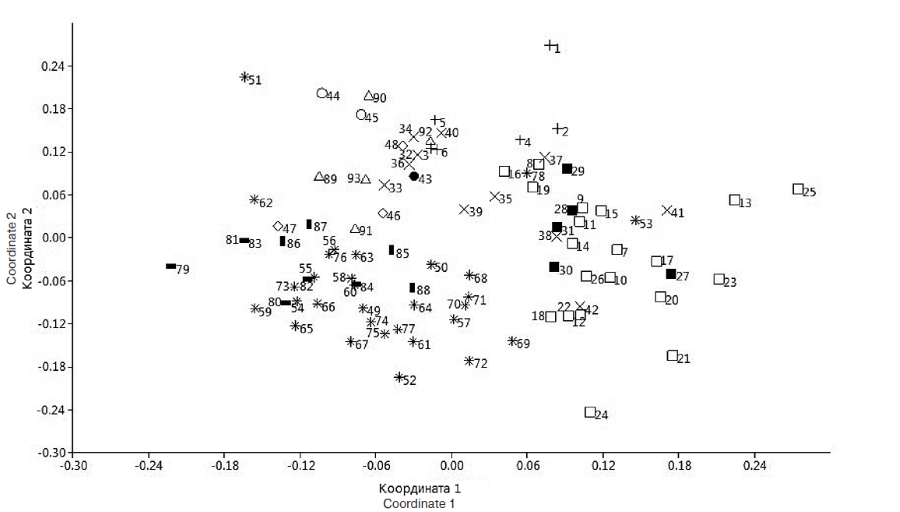 Рис. 3. Дифференциация изучаемых образцов A. regelianum, выявленная по данным ISSR-анализа с использованием метода главных координат. Одинаковыми символами обозначены образцы из одной популяции: + — Быковский район, лиман Тажи (№ 1–6); o — Николаевский район, лиман Хреноватый (№ 7–26); n — Николаевский район, лиман Медвежий (№ 27–31); × — Николаевский район, лиман Богатырев (№ 32–42); l — Иловлинский район, хут. Ерецкий (№ 43); ¡ — Фроловский район, хут. Выездинский (№ 44–45); ◊ — Серафимовичский район, хут. Дружилинский (№ 46–48); * — Серафимовичский район, хут. Красноярский (№ 49–78); — Серафимовичский район, хутор Буерак-Поповский (№ 79–84); — Серафимовичский район, хут. Новоалександровский (№ 85–88); ∆ — Алексеевский район, станица Усть-Бузулукская (№ 89–93)