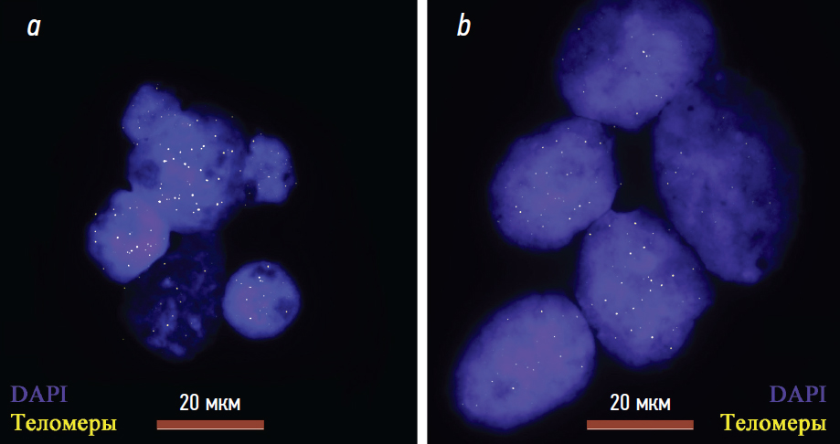 Authors’ contribution. All authors made a substantial contribution to the conception of the study, acquisition, analysis, interpretation of data for the work, drafting and revising the article, final approval of the version to be published and agree to be accountable for all aspects of the study. Personal contribution of each author: A.V. Tikhonov — experimental design, collecting and preparation of samples, microscopic analysis, data analysis, imagine design, writing the main part of the text; O.A. Efimova — experimental design, writing the main part of the text; M.I. Krapivin — collecting and preparation of samples, Q-FISH, microscopic analysis, imagine design; O.V. Malysheva — collecting and preparation of samples, aCGH; E.M. Komarova — collecting and preparation of samples; A.V. Golubeva — collecting and preparation of samples, FISH; A.A. Pendina — experimental design, data analysis, writing the main part of the text, making final edits.
