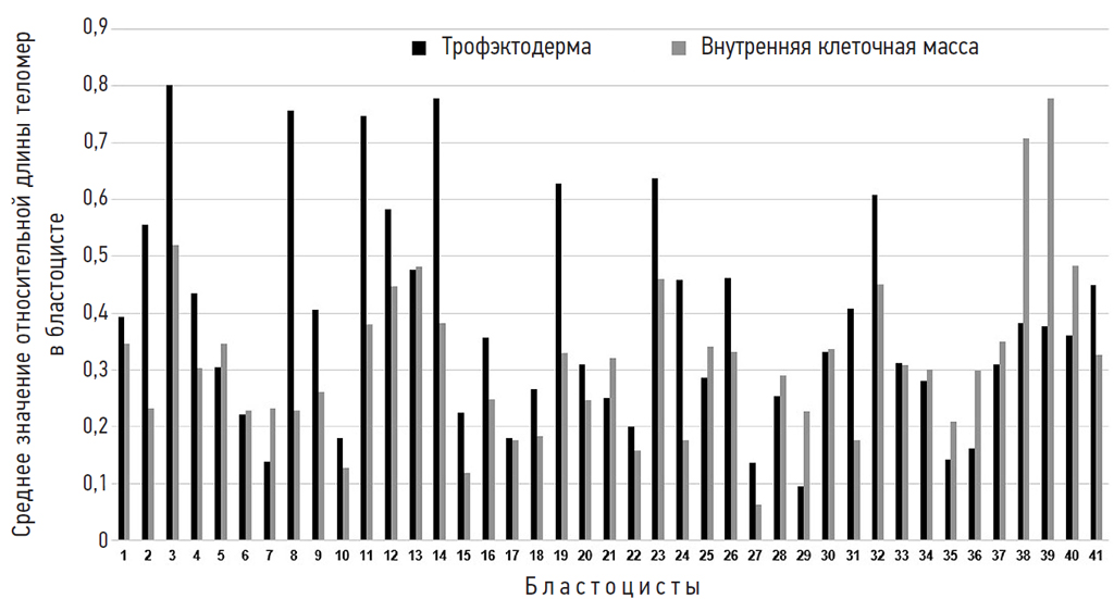 Рис. 2. Средние относительные длины теломер в трофэктодерме и внутренней клеточной массе 41 бластоцисты человека
