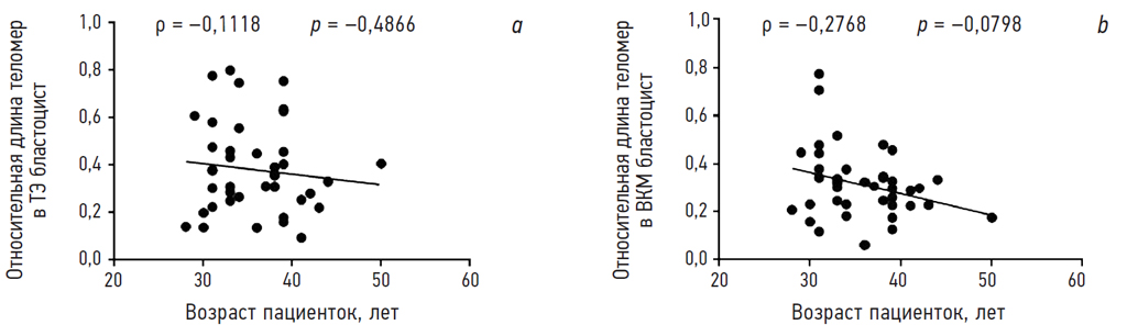 Корреляционный анализ не позволил установить достоверной взаимозависимости между возрастом пациенток, от которых получены бластоцисты и относительной длиной теломер в их ТЭ (ρ = –0,1118, p = 0,4866) и ВКМ (ρ = –0,2768, p = 0,0798; рис. 3).