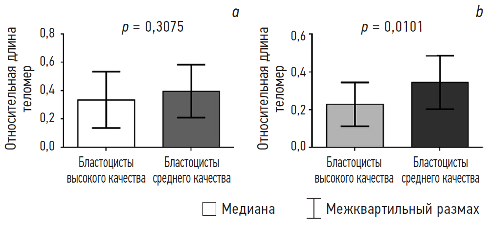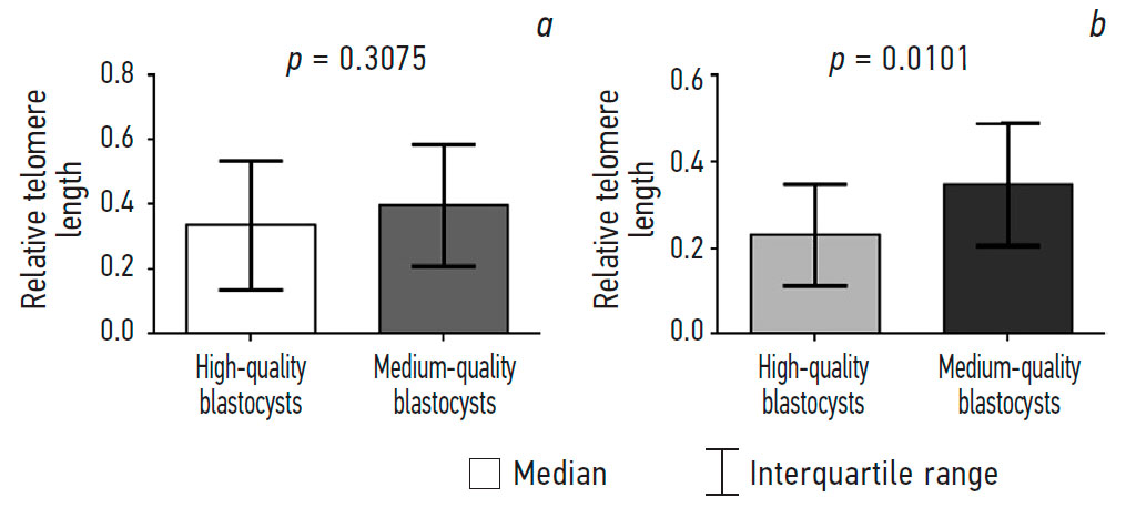Рис. 4. Сравнение относительной длины теломер между бластоцистами высокого и среднего качества. Длина теломер не отличается в трофэктодерме (a), однако во внутренней клеточной массе (b) бластоцист среднего качества теломеры длиннее, чем у бластоцист высокого качества