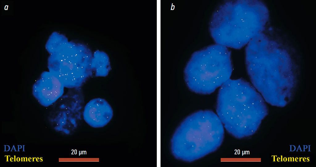 Рис. 1. Интерфазные ядра трофэктодермы (а) и внутренней клеточной массы (b) бластоцисты человека после выявления теломер методом Q-FISH с использованием теломерных ДНК-зондов (желтый) и окрашивания DAPI (синий)