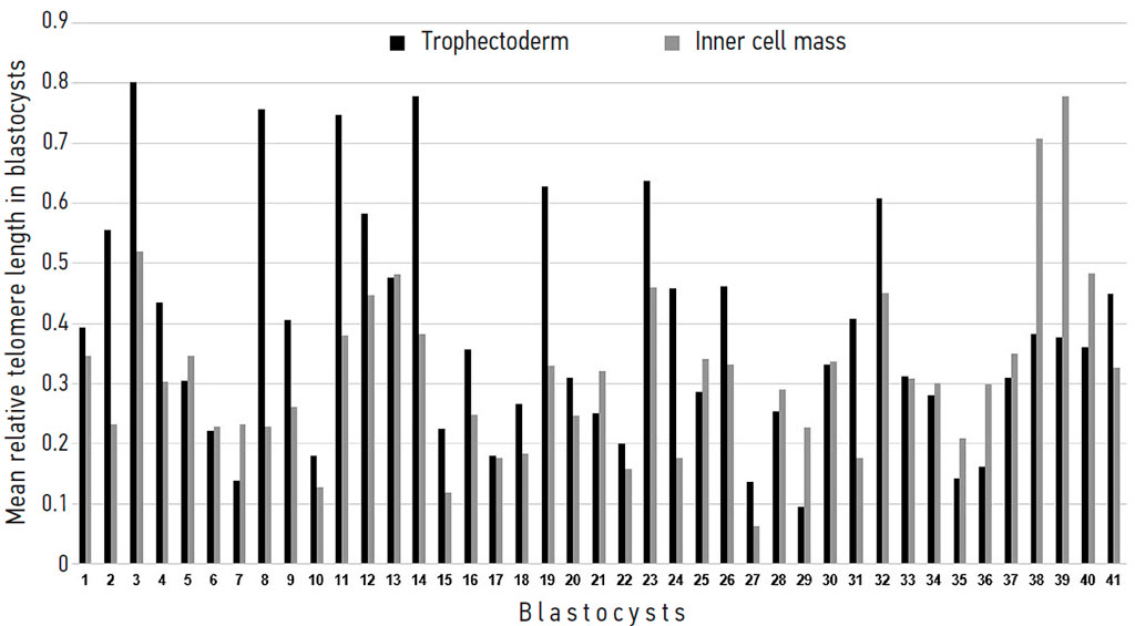 Telomeres are critical in cell viability, and the proper regulation of their length during cleavages is a prerequisite for normal embryonic development. Furthermore, the establishment of a certain telomere length in the blastocyst compartments during differentiation of blastomeres into the TE and ICM and the preparation of the blastocyst for implantation and active growth is obviously an important stage. However, the paucity of data regarding telomere length in human blastocysts is primarily attributable to the challenges in obtaining research material and methodological difficulties in the analysis of paucicellular samples.