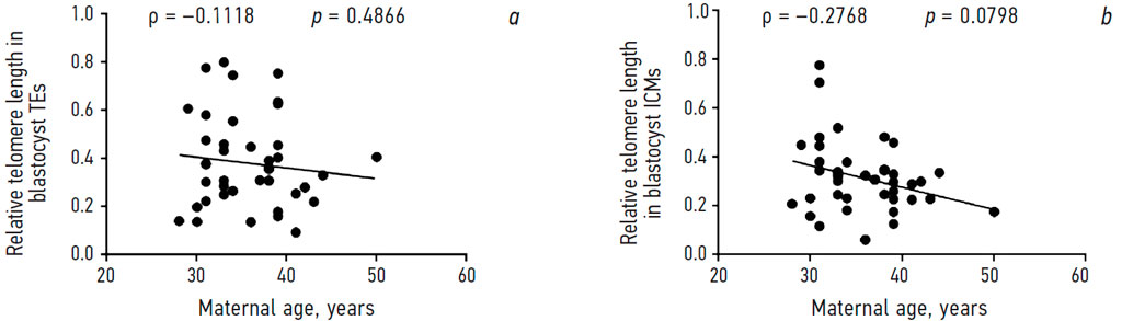 The correlation analysis showed no significant relationship between maternal age and relative telomere length in the TE (ρ = –0.1118, p = 0.4866) and ICM (ρ = –0.2768, p = 0.0798; Fig. 3).