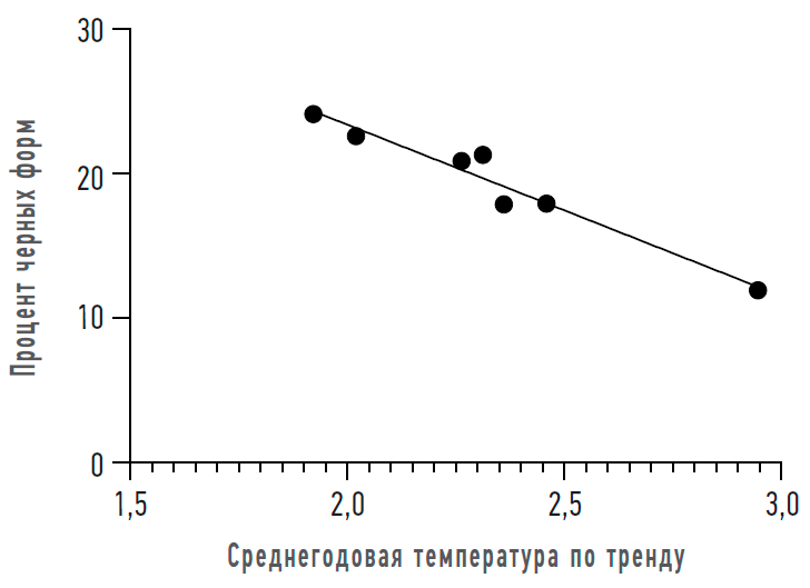 Состав популяции A. bipunctata Архангельска в разные годы представлен в табл. 1. В табл. 2 дана рассчитанная по тренду изменений среднегодовая температура года сбора. Средняя годовая температура за период наших наблюдений значимо возросла (y=0,048x – 95,82, R2=0.334, p=0,00003). За 21 год наблюдений доля черных особей в популяции заметно снизилась (табл. 2). На графике рис. 1 видно, что это снижение происходило в линейной зависимости от повышения среднегодовой температуры (y=–23,71x+94,24; R2=0,950, p=0,0002).