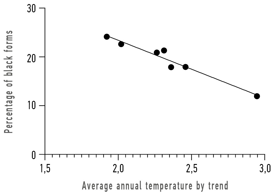 The composition of the A. bipunctata population in Arkhangelsk in different years is presented in Table 1. Table 2 shows the calculated trend-based average annual temperature for the year of sample collection. There was a significant increase in the average annual temperature over the study period (y=0.048x–95.82, R2=0.334, p=0.00003). Over 21 years of observation, the proportion of black morphs in the population decreased significantly (Table 2). The graph in Fig. 1 shows a linear relationship between this decrease and the increase in average annual temperature (y=–23.71x+94.24; R2=0.950, p=0.0002).