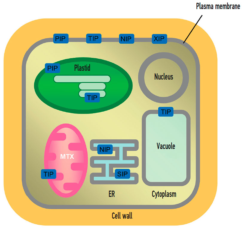 Рис. 1. Клеточная локализация аквапоринов. PIP-, TIP-, NIP- и XIP-аквапорины локализуются преимущественно в плазматической мембране и присутствуют на всей поверхности клетки. SIP-аквапорины и некоторые NIP-аквапорины были обнаружены в мембране эндоплазматической сети (ЭПС). TIP-аквапорины локализуются в тонопласте — мембране вакуоли. Было предсказано, что некоторые PIP- и TIP-аквапорины локализуются во внутренней мембране хлоропласта и мембране тилакоидов. Ряд представителей TIP-аквапоринов выявлен в мембранах митохондрий (МТХ)