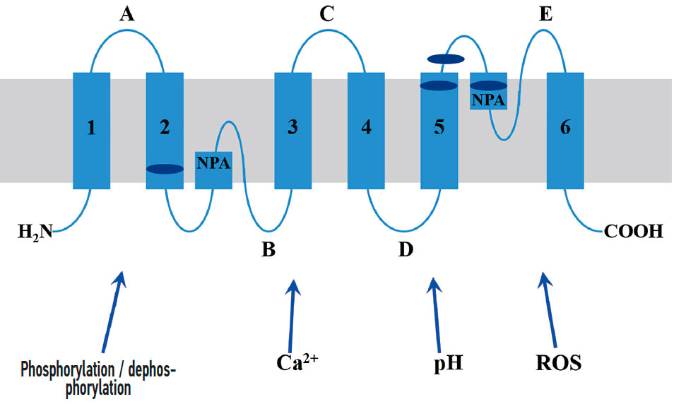Aquaporins are a large family of membrane transport proteins that function as selective channels for the transport of water and other molecules, including gases, through cell membranes along a concentration gradient in both directions [4]. Aquaporins are characterized by a high transport rate that exceeds that of many other transporters, including ion channels. In some cases, the transport rate may reach more than a billion water molecules per second [5]. Aquaporins belong to the family of highly conserved major intrinsic proteins (MIP). Representatives of this family have been identified in all living organisms, except for thermophilic archaea and several bacteria [6].