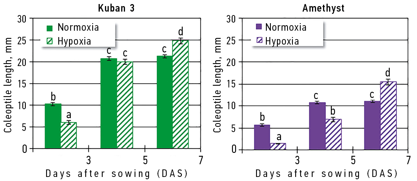 Fig 1. The growth of rice seedlings coleoptiles of two varieties (fast-growing variety Kuban 3; slow-growing variety Amethyst) under normoxia and hypoxia. Values with different letters (a–d) are significantly different (Tukey’s test, p <0.05).