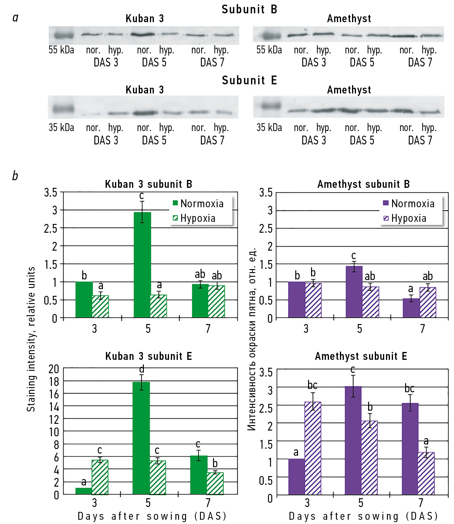 Рис 2. Изменение содержания белков субъединиц B и E Н+-АТФазы в составе микросомальной фракции клеток колеоптилей проростков риса двух сортов (быстро растущий сорт Кубань 3; медленно растущий сорт Аметист) в условиях нормоксии и гипоксии: а — вестерн-блот гибридизация проб белка микросомальной фракции с антителами против субъединиц B и E. 35 и 55 кДа — маркеры молекулярного веса; нор. — нормоксия, гип. — гипоксия. Отсканированные изображения характерных блотов; b — относительное изменение содержания белков. Значения с разными буквами (a–d) достоверно различаются (взвешенное среднее Тьюки, p <0,05).