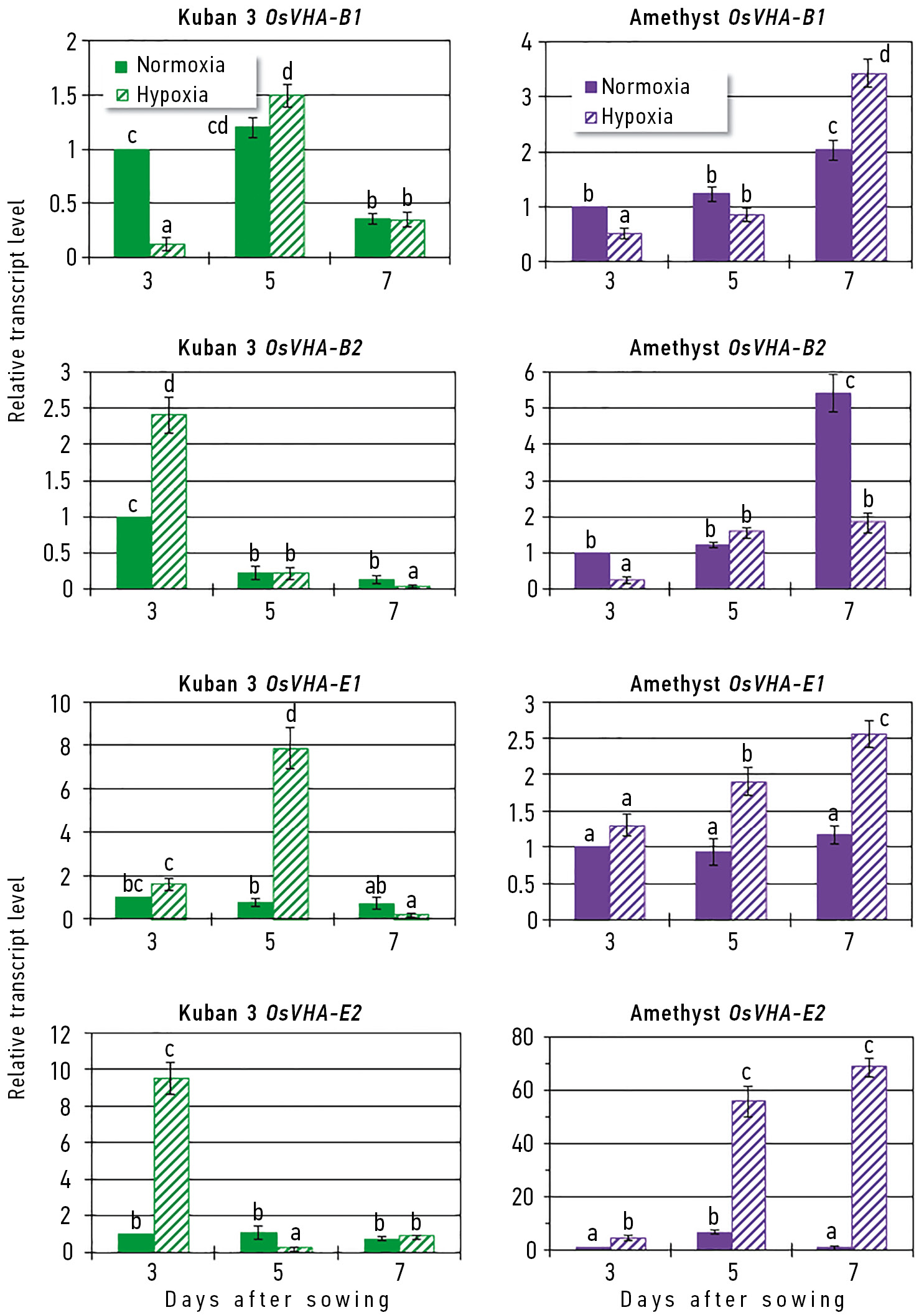 Fig 3. Changes in the relative level of accumulation of OsVHA-B1, OsVHA-B2, OsVHA-E1, and OsVHA-E2 gene transcripts in coleoptiles of rice seedlings of two varieties (fast-growing variety Kuban 3; slow-growing variety Amethyst) under normoxia and hypoxia conditions. Values with different letters (a–d) are significantly different (Tukey’s test, p <0.05).